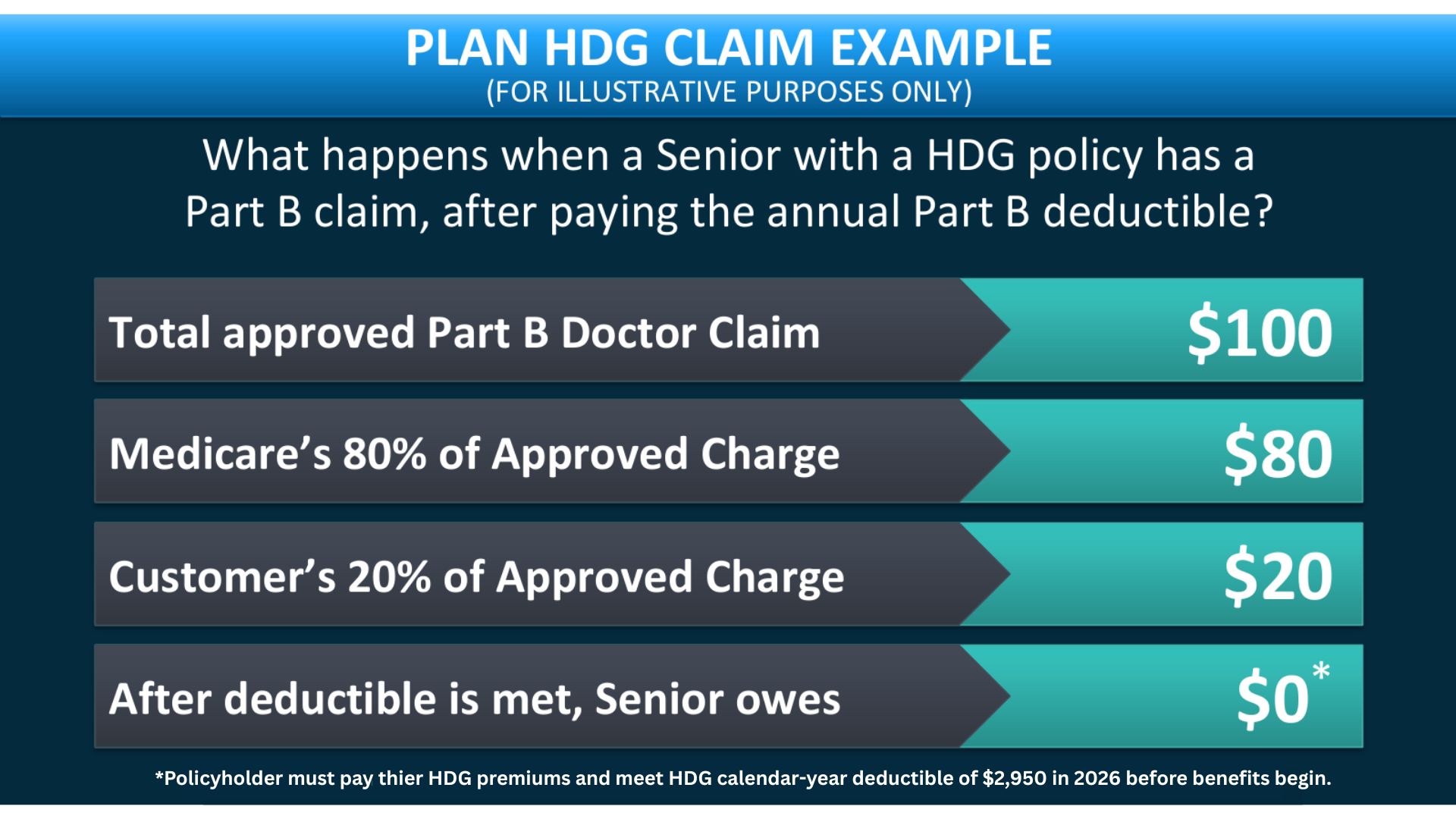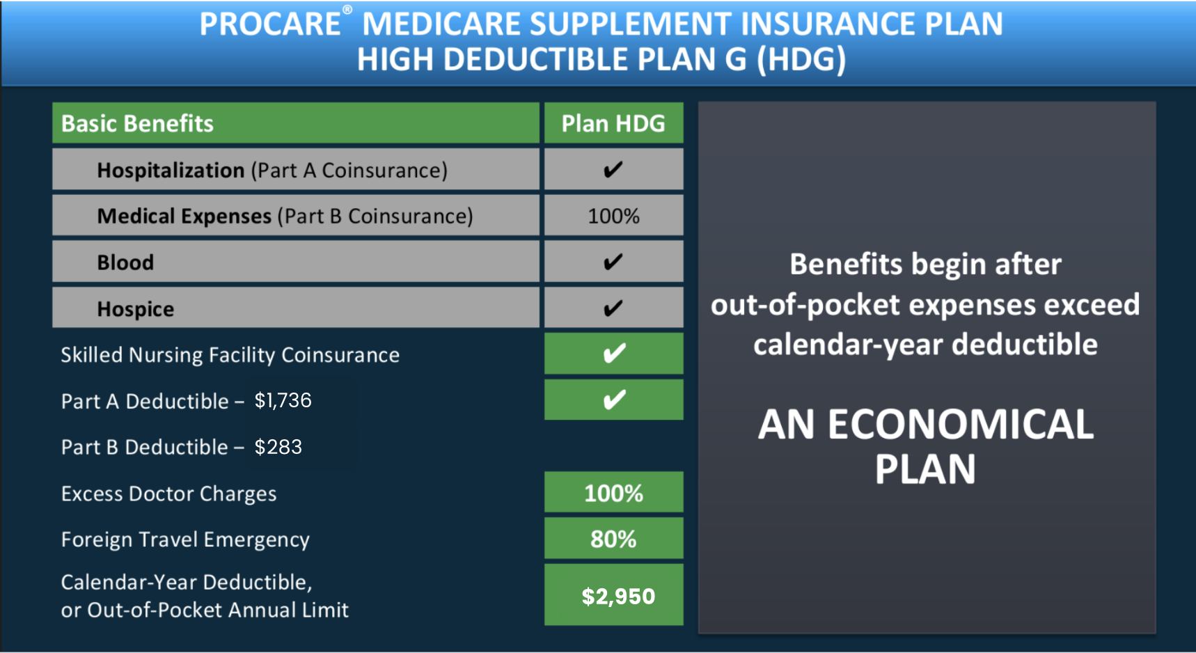 The HDG Plan is a Medicare Supplement plan that offers the same coverage as the standard Plan G. The HDG Plan is a great option for people who want the benefits of Plan G but would prefer lower monthly premiums and a known out-of-pocket.